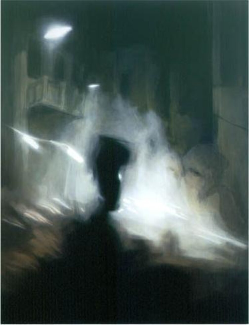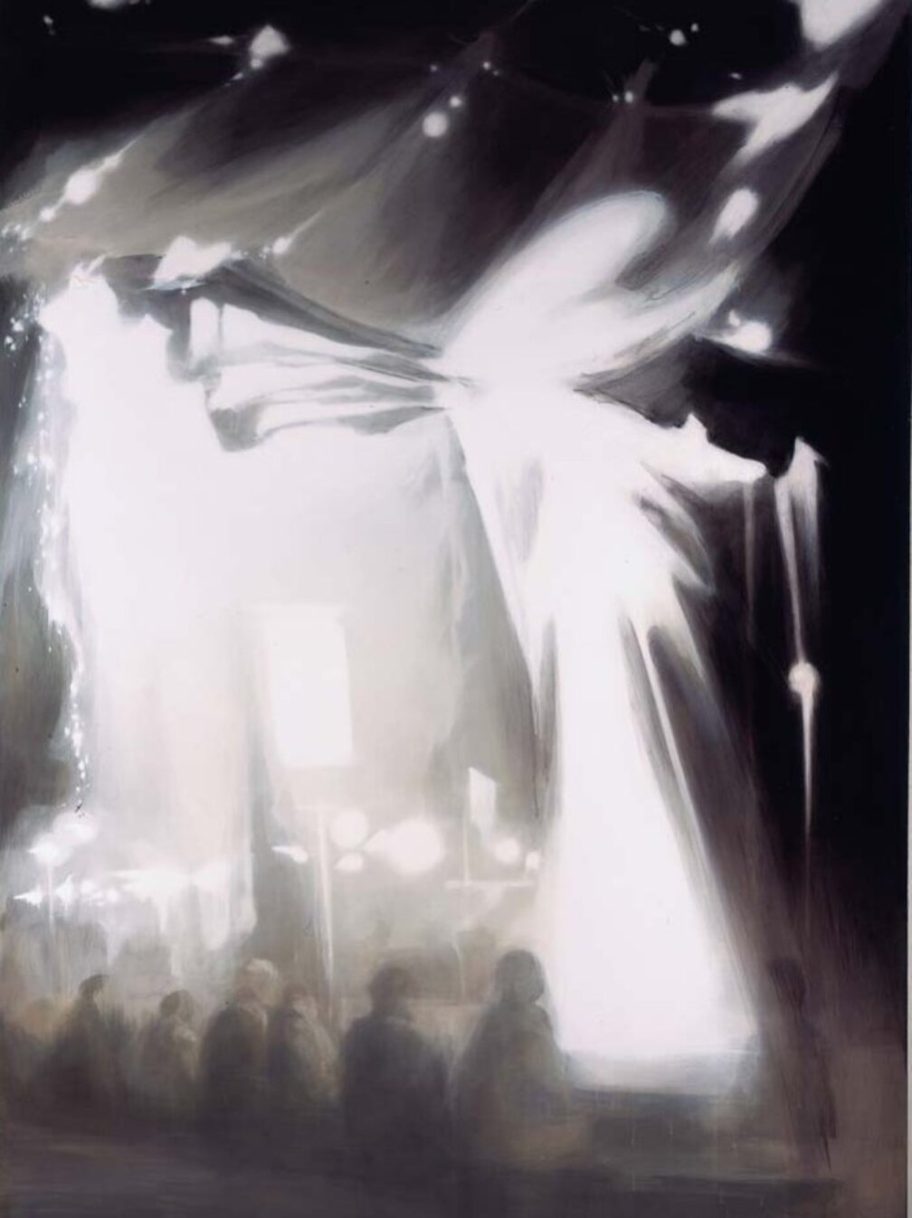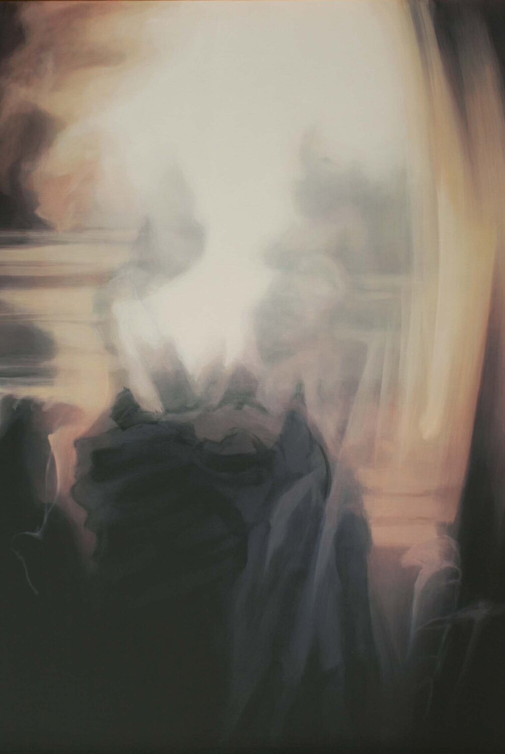 In her paintings, light and perspective become central subjects. Works such as Doll Hospital present demure figures caught between radiance and obscurity—a woman poised in brightness, her indistinct face lending an eerie tension to the scene. Other works, like Oracle and The Choir, move toward abstraction, evoking spirituality and otherworldly presence without direct religious imagery.